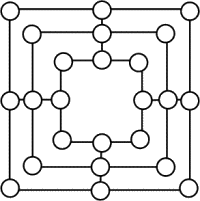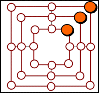 Co taboleiro valeiro, os xogadores comenzar a colocar as súas pezas de forma alternativa. Cada vez que un xogador consigue colocar tres fichas en liña (a esta formación chámase muiño, ver figura) retira unha peza do adversario, a que desexe, agás as que forman parte dun muiño. Despois de colocar as nove pezas, estas poden moverse cara as casiñas baleiras, avanzando en calquera dirección unha soa casiña.
