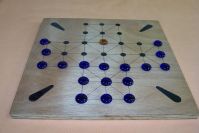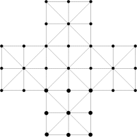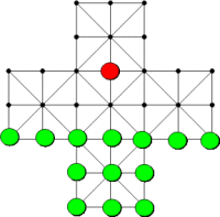 Xógase nun taboleiro en forma de cruz coma o do debuxo con trinta e tres posicións. As pezas son de dúas cores unha para a raposa e outra para os gansos.