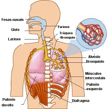 O aparato respiratorio encárgase de toma-lo osíxeno do aire e expulsa-lo dióxido de carbono ó exterior. Está formado por: fosas nasais , farinxe, larinxe, bronquios, alvéolos e pulmóns.