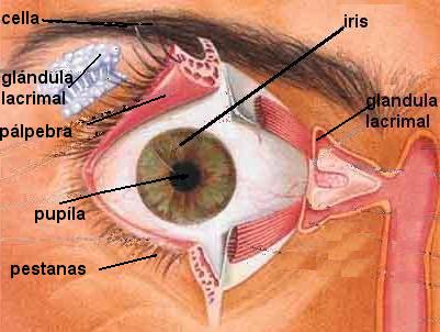 Os ollos son os órganos do sentido da vista, na ilustración podes distinguir as súas partes:
