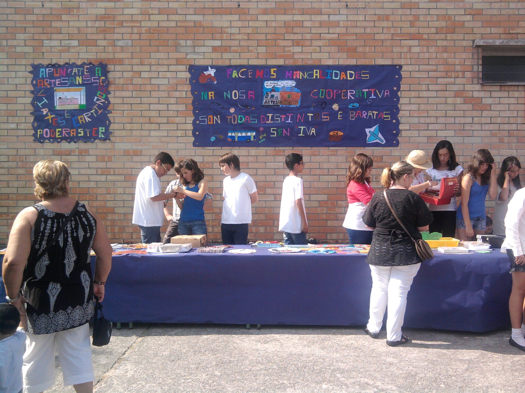 El C.E.I.P. de Lourido tiene en marcha dos cooperativas formadas por el alumnado del tercer ciclo de primaria. La primera de ellas tiene por nombre "Compost S.C." y está destinada a la elaboración de compost para abonar los jardines del colegio. La segunda cooperativa se llama "Artesans S.C." y su finalidad es la construcción de productos de artesanía utilizando, principalmente, materiales encontrados en las playas de la zona. Con ello cumplimos con uno de los objetivos principales del colegio commo miembro de la red "Agenda Escolar 21 de Galicia", que es el introducir criterios de sostenibilidad en las acciones realizadas por el centro. Estos materiales son vendidos en las fiestas del colegio y las ganancias se invierten en compra de pinturas, pinceles, rotuladores, etc; para poder seguir trabajando. Al final del curso, en la asamblea final de la cooperativa se reparten las ganancias entre los cooperativistas y se deja un fondo para poder iniciar el trabajo de la cooperativa al curso siguiente. Aqui tenemos unas fotografías de la venta de productos que se realizó en el mes de junio, aprovechando las fiestas de fin de curso del colegio y los emblemas de nuestras cooperativas.