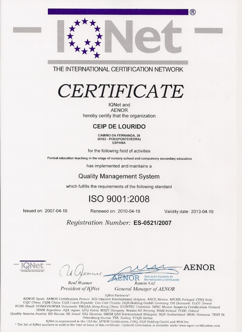 O sistema de calidade do colexio está baseado na Norma UNE-EN ISO 9001-2008 e conta coa certificación de AENOR. A través deste enlace se pode acceder ao índice do sistema. Premer EIQUI. Informe de resultados da enquisa de grao de satisfacción realizada en maio de 2012. |