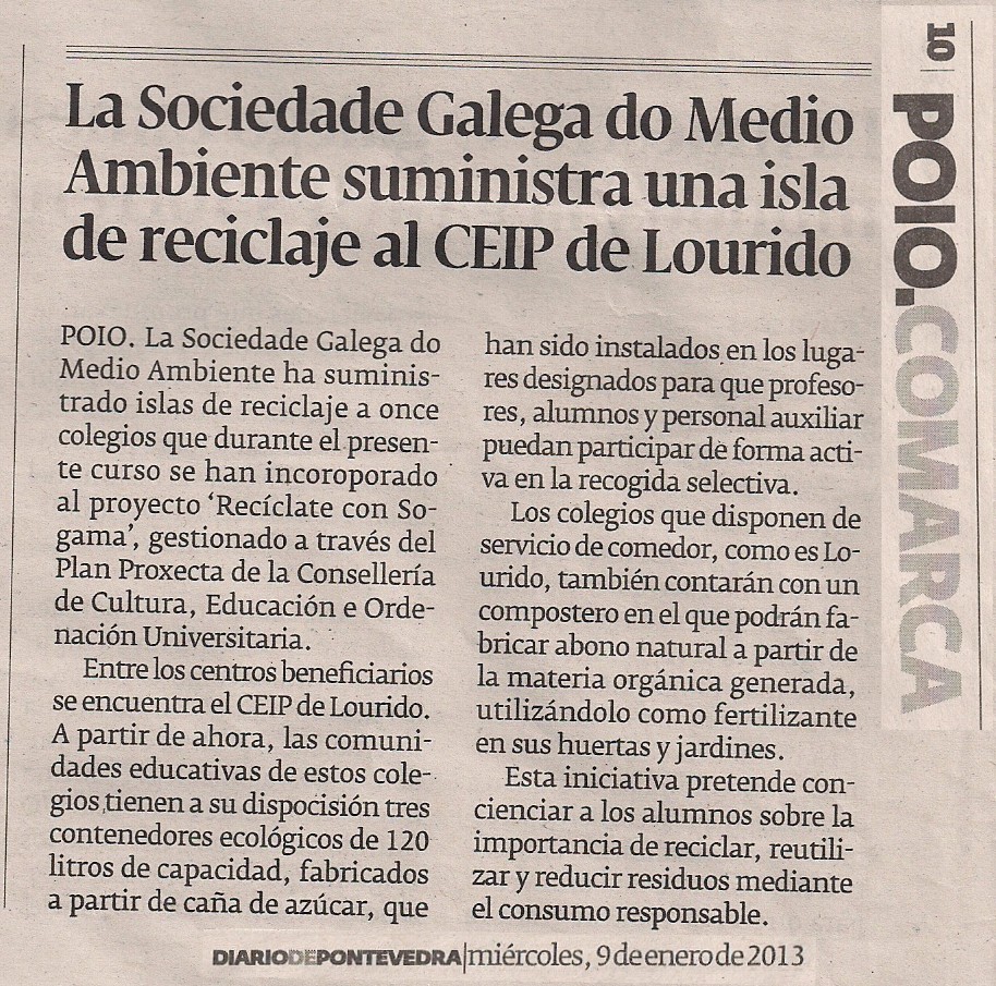 RECÍCLATE CON SOGAMA "Recíclate con Sogama" é un programa para fomentar a recollida selectiva a través de illas de reciclaxe escolares que Sogama facilitará aos centros participantes. O profesorado contará con formación inicial nas dependencias de Sogama en Cerceda (A Coruña), con recursos didácticos en soporte dixital e con material divulgativo de apoio para a creación dun proxecto interdisciplinar e cooperativo centrado na actividade diaria de separación do lixo por parte do alumnado participante. Iniciamos as actividades do curso 2012-13 coa colocación en todas as aulas do centro das bolsas de reciclaxe, para a separación do lixo xerado diariamente.