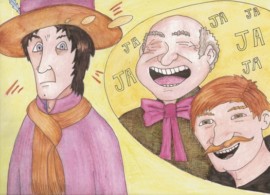 - VAITE DA NOSA VILA. ¿PENSAS QUE IMOS PAGARCHE TANTO OURO SÓ POR TOCAR A FRAUTA?- E SOLTARON UNHAS GRANDES RISADAS. DESPOIS A XENTE DA VILA TAMÉN SE BURLOU DEL CANDO SAÍU Á RÚA.