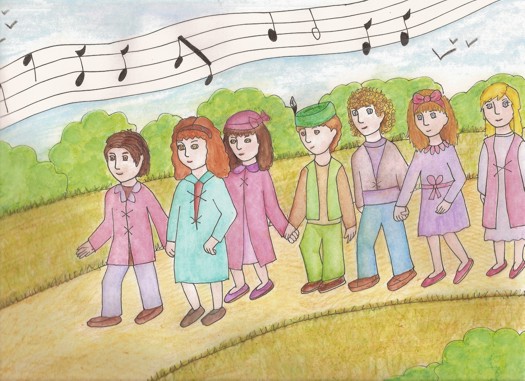 COLLIDOS DA MAN E CUN GRAN SORRISO NA CARA, FORMABAN UNHA GRAN RINGLEIRA, E POR MÁIS QUE OS SEUS PAIS OS CHAMABAN, ELES SEGUIRON Ó FRAUTISTA, QUE OS LEVOU A UN LUGAR MOI AFASTADO, TAN AFASTADO QUE NINGUÉN SOUBO ONDE SE FORON XA QUE NUNCA VOLTARON.