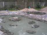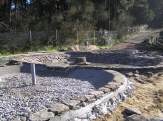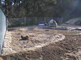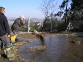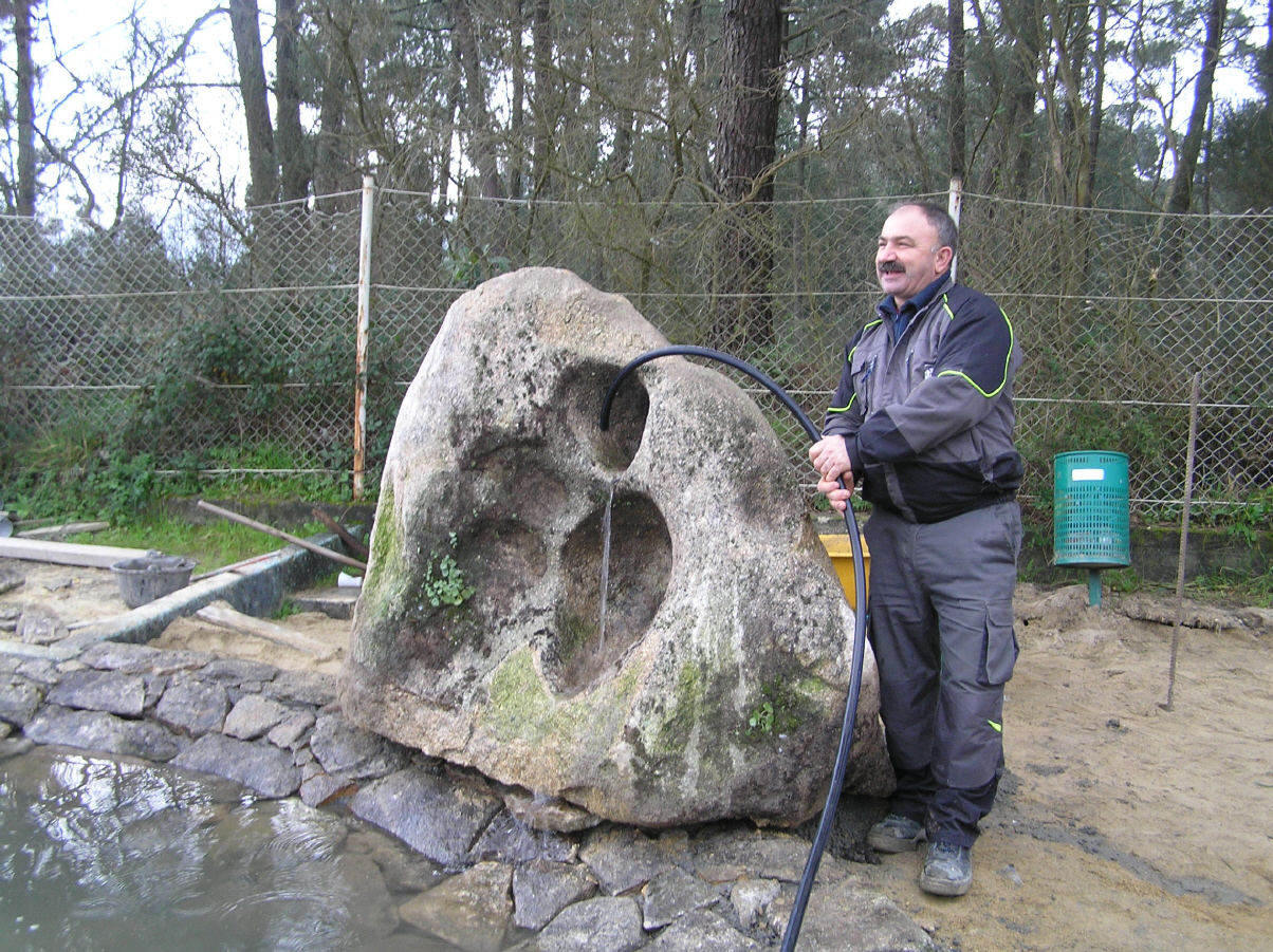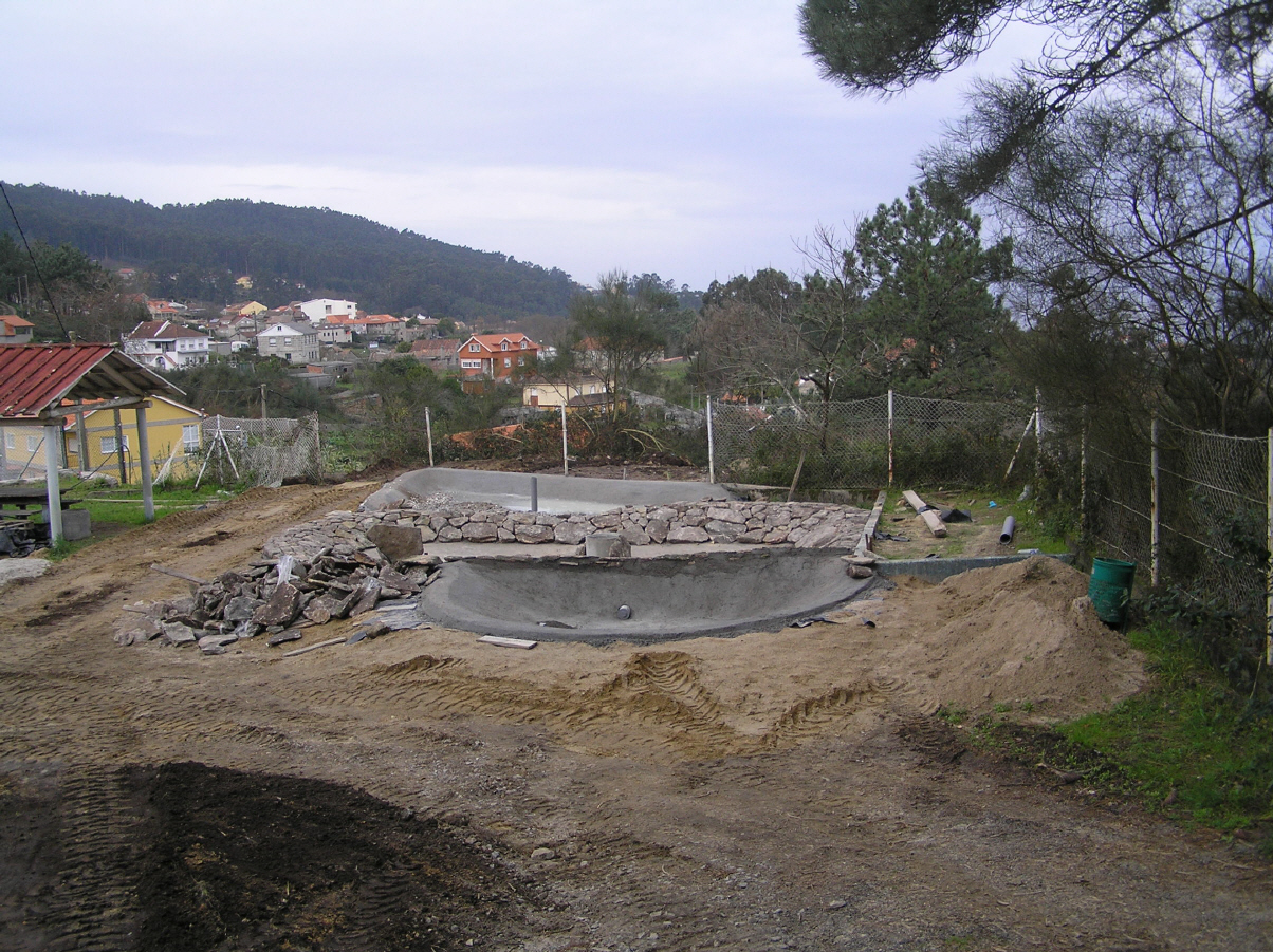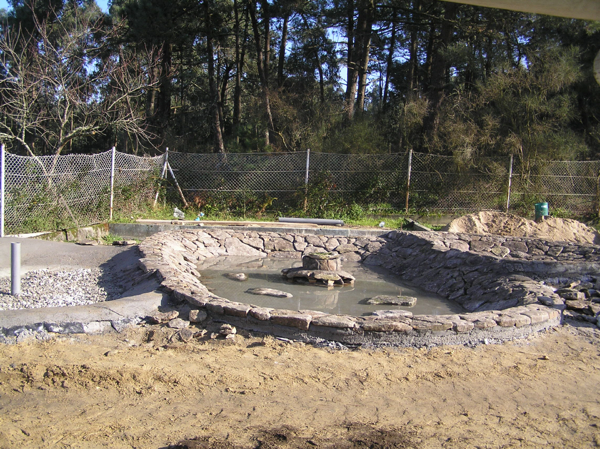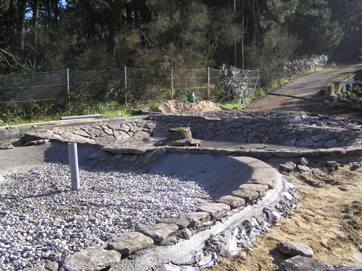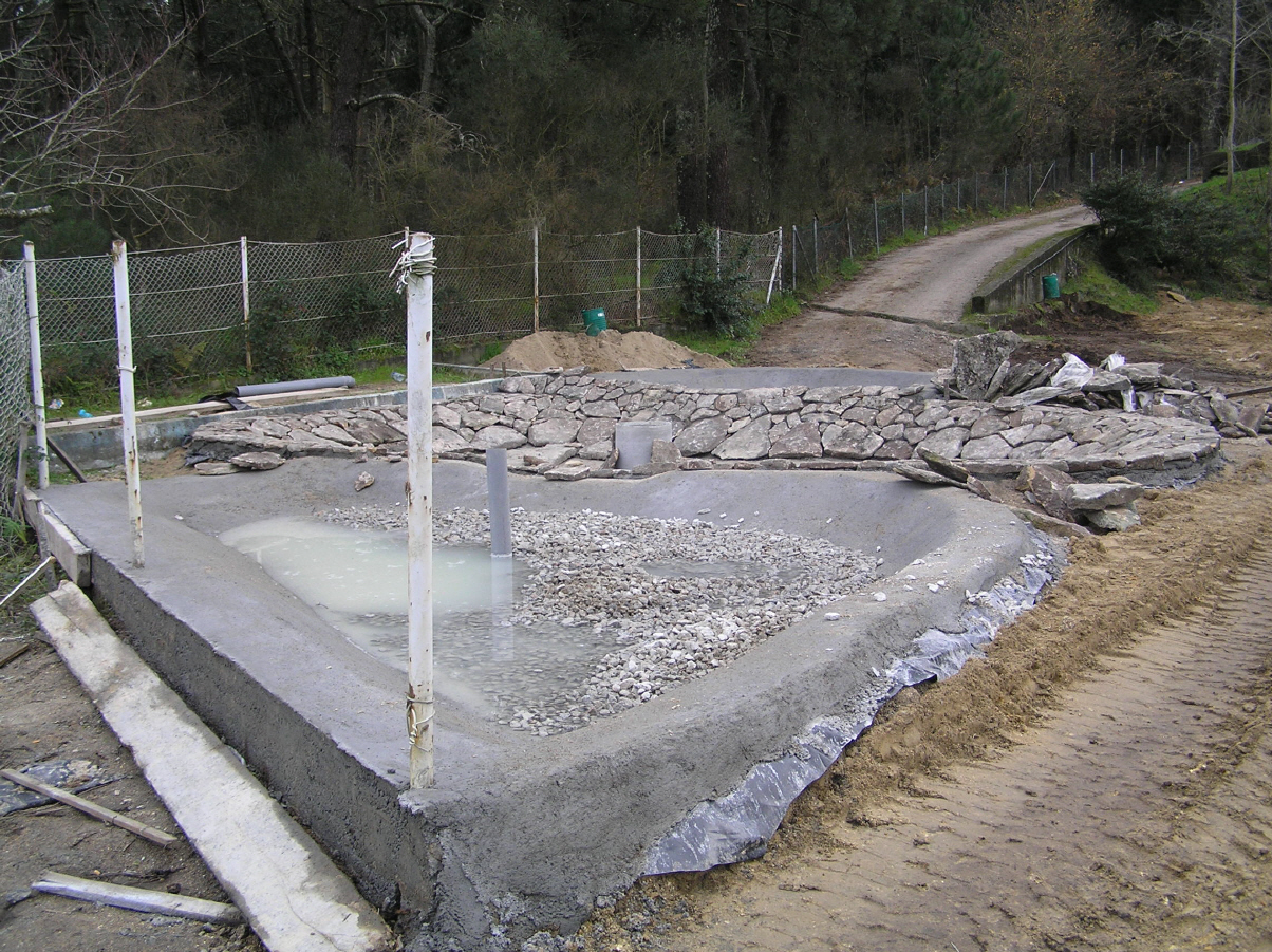- Cunha escavadora fixéronse os tres vasos e instaláronse os desaugues coas correspondentes chaves de paso e dúas arquetas: unha para a captar a auga que rebosa dos pozos do colexio e outra para canalizar a saída hacia as cañerías de recollida de augas pluviais do barrio. Estendeuse un plástico para impermeabilizar os vasos e recubriuse todo cunha estrutura de cemento reforzada con malla metálica. Para finalizar, forráronse os estanques perimetralmente con pedra natural.