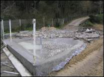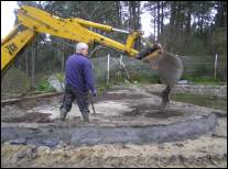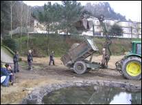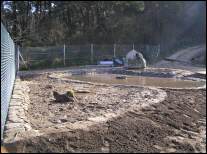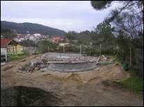 Cunha escavadora fixéronse os tres vasos e instaláronse os desaugues coas correspondentes chaves de paso e dúas arquetas: unha para a captar a auga que rebosa dos pozos do colexio e outra para canalizar a saída hacia as cañerías de recollida de augas pluviais do barrio. Estendeuse un plástico para impermeabilizar os vasos e recubriuse todo cunha estrutura de cemento reforzada con malla metálica. Para finalizar, forráronse os estanques perimetralmente con pedra natural. |