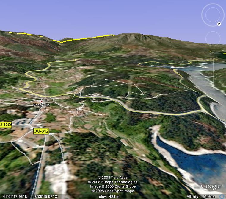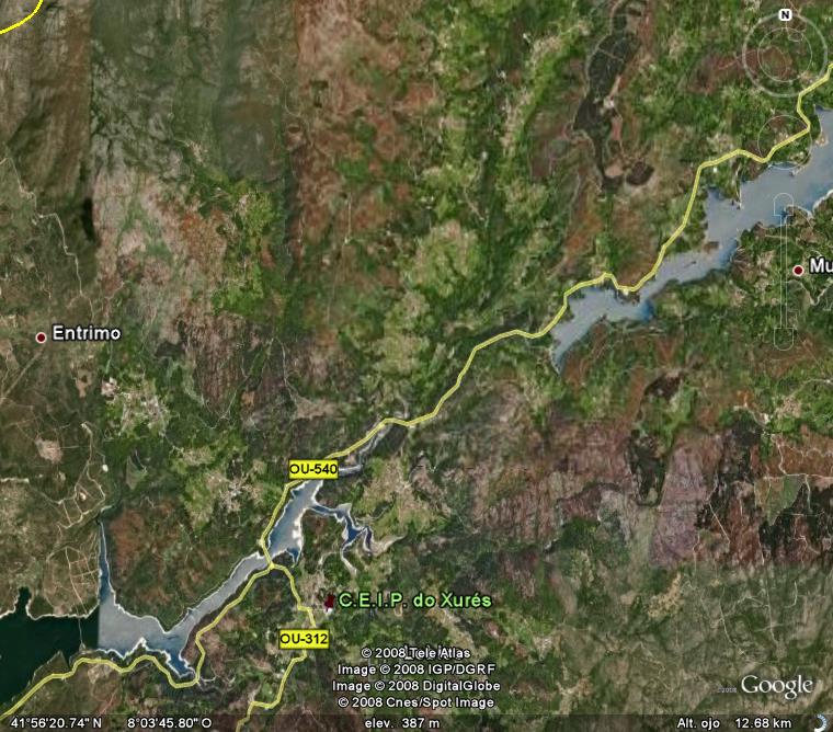 Pero o obxectivo inicial era chegar ó colexio... Unha vez no encoro do Lindoso xa vemos a indicación cara Lobios, aínda que na señal poña "Lovios", con uve. Fotografía satélite da zona.