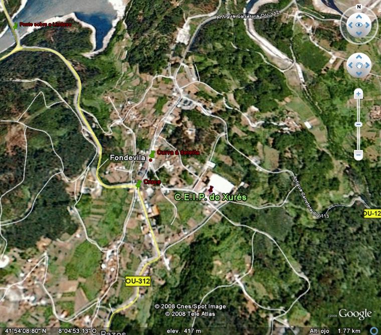 Xa en Lobios entramos nun cruce amplo, hai que coller á esquerda. Inmediatamente atopamos unha curva á dereita cunha pendente moi pronunciada. cento cincuenta metros máis adiante está o colexio. Fotografía satélite ampliada.