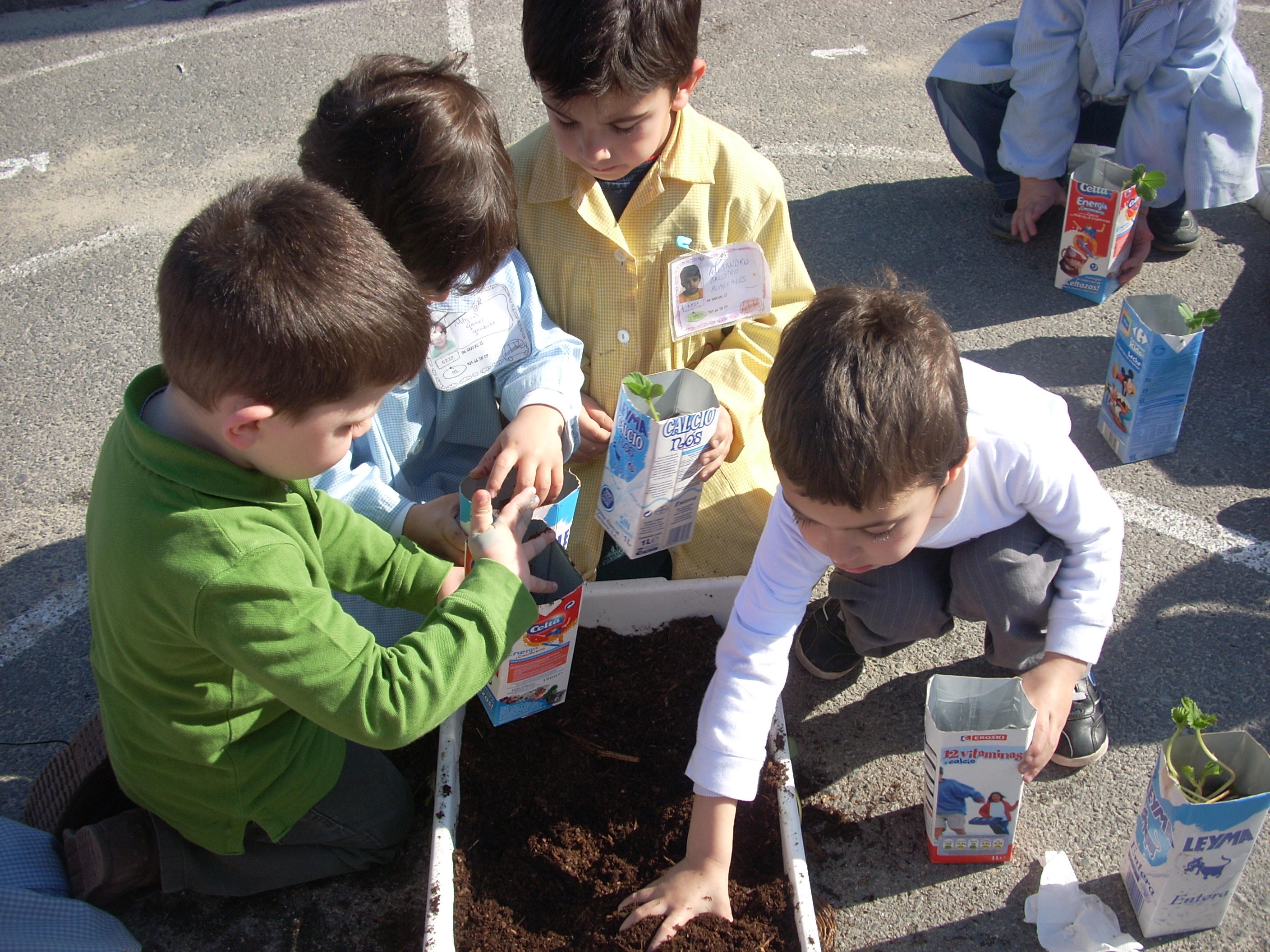 Enchemos de terra. Regamos. Despois puxémolas na ventá para que lles