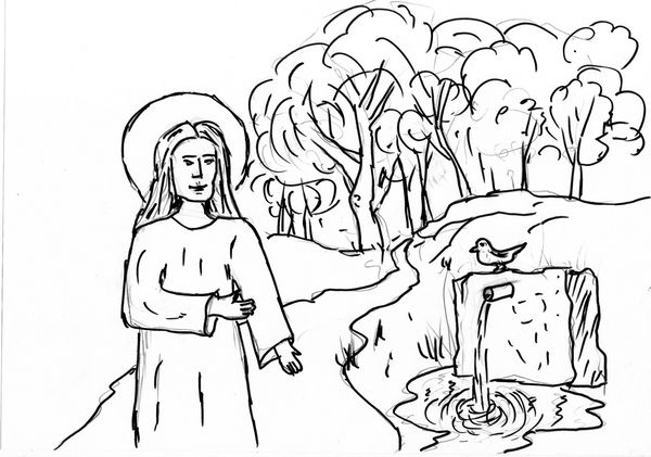 O Santo ensemismado durante 200 anos escoitando un paxara ao lado dunha fonte.