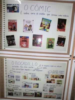 Do 5 ao 16 de maio celebramos a III SEMANA DO CÓMIC no noso cole. Este ano como novidade colocamos uns paneis informativos cos diferentes tipos de planos (xeral, medio, primeiro, ...). O alumnado unha vez localizados estes planos en varios cómics, podía recortalos e pegalos nunhas follas preparadas para a ocasión. Fixemos uns cadernos de traballo dunha forma práctica. Tamén podían encher bocadillos para construir unha historia. Na aula de inglés fixeron os seus propios cómics.