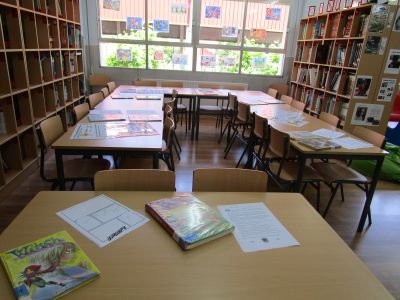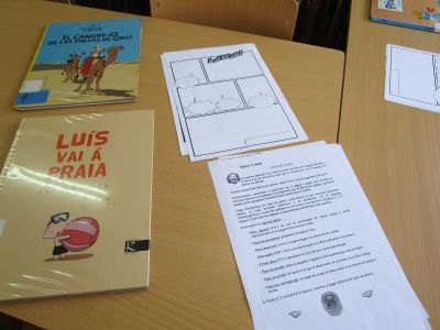 do 22 de maio ao 2 de xuño, traballamos o cómic. Nos paneis, púxose información sobre os distintos tipos de planos dun cómic, viñetas, bocadillos, ... Nas mesas da biblio puxéronse actividades para que os nenos e nenas as traballaran. |