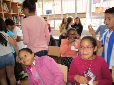 "ESCARLATINA, A COCIÑEIRA DEFUNTA" cos nenos e nenas de 5º. Despois de pasar un agradable rato con ela, todos degustamos algunhas receitas do seu libro feitas polos nenos e nenas. |