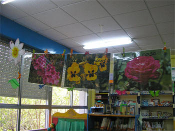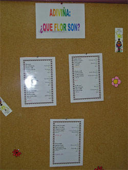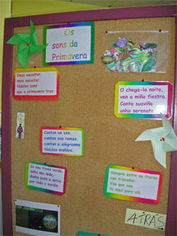 Na entrada da biblioteca hai un panel primaveral con adiviñas relacionadas cos diferentes sons da primavera. Tendes tamén os debuxos destes sons a ver se sodes quen de relacionalos. |