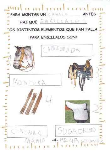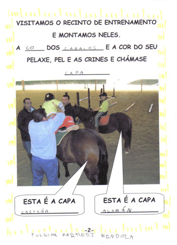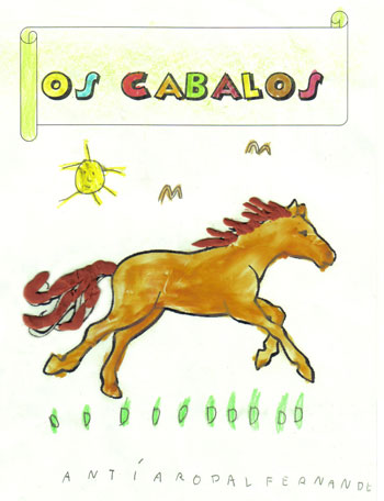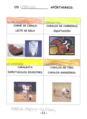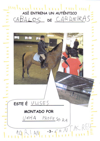 Eleximos Os Cabalos como tema do noso proxecto por unha visita que fixemos o Clube Hípico Alazán de San Cosme en Mos. Os cabalos apasionáronnos, gustounos moitísimo montar a cabalo. Gústanos o seu pelaxe, a súa forza, como trotan, saltan, corren e como non acaricialos. Para nós este proxecto é un homenaxe a eles, para demostrar a admiración que lles temos e o interesados que estamos en saber máis sobre eles. Alí contáronnos moitas cousas que nos sorprenderon porque non as sabíamos como que os cabalos non teñen cores senon capas e outras máis. Ademais de aprender todo isto tamén probamos varias técnicas para ter cabalos na nosa aula: debuxámolos, pintámolos, fixémolos en plastilina e incluso fixemos o noso propio cadro de cabalos como auténticos pintores. As ideas sacámolas mirando fotografías, cadros de diversos pintores e incluso esculturas de cabalos que temos na nosa cidade. ¡¡¡Cantas cousas novas sabemos!!! Eiquí tedes unha pequena mostra: