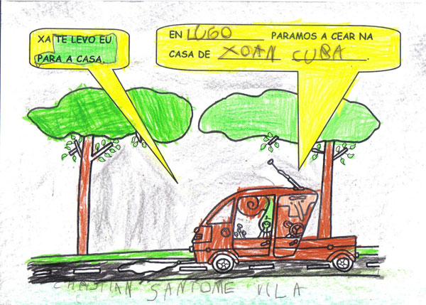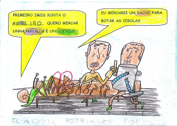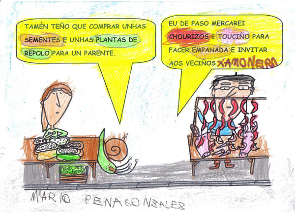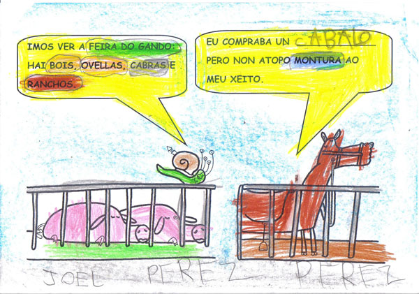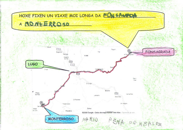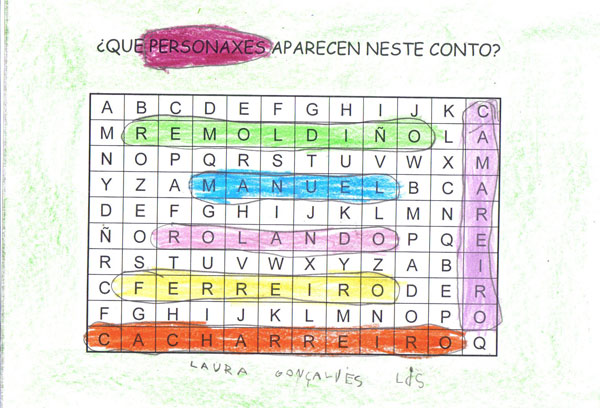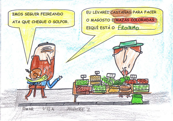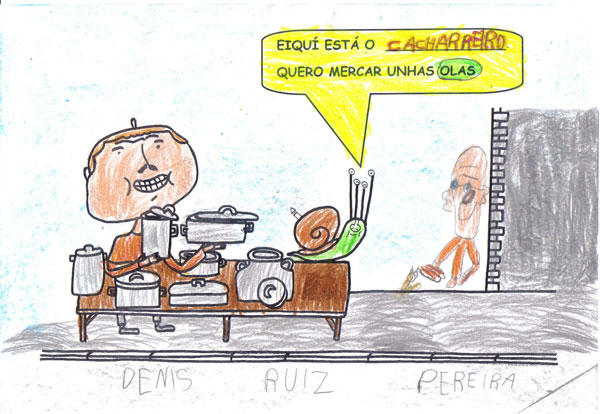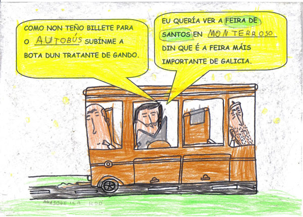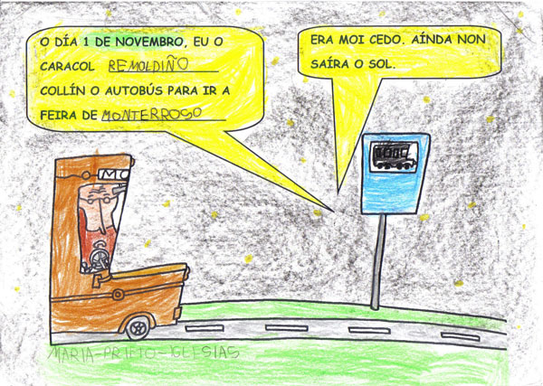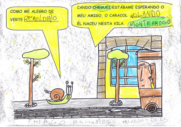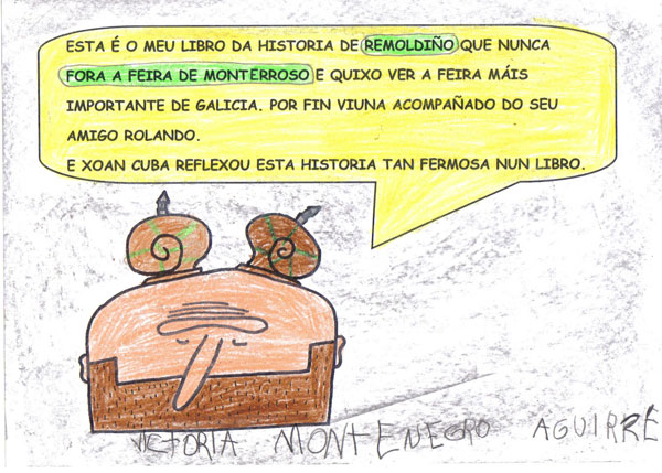 Este ano os Reis Magos trouxéronnos un agasallo moi especial, o conto "Remoldiño vai á feira" de Xoan Cuba, da colección Merliño de Xerais. Témolo tódolos nenos e nenas da clase e gustounos tanto a súa historia que fixemos o noso propio libro desta historia. Remoldiño nunca fora a Monterroso na vida, e quería ver a feira máis famosa de Galicia. Para viaxar no autobús sen billete argallou unha artimaña: subíuselle nunha bota de un tratante da montaña. Na feira estábao agardando un vello amigo, o caracol don Rolando que nacera nesa vila.