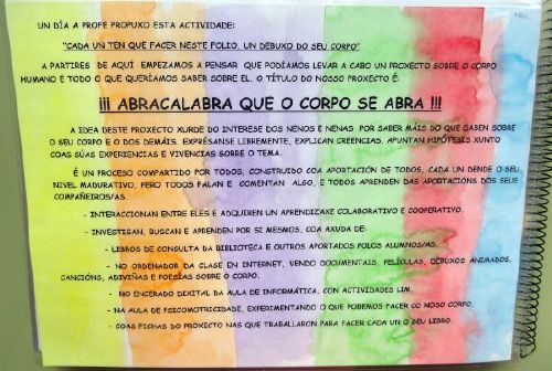 Este proxecto xurde polo interese dos nenos e neas da aula de 4 anos B por saber máis do que sabían sobre o seu corpo e o dos demais. Decidimos investigar para dar resposta a todas aquelas dúbidas que os nenos e nenas ían plantexando na clase ao longo de todo o proceso. Fíxádevos atentamente todos os que descubrimos e tentade descubrir vos algúns máis. |