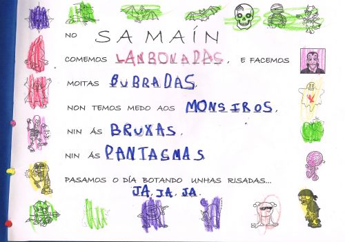 Os nenos e nenas da aula de 5 anos B están aprendendo moitas cousas sobre O SAMAÍN, e para aprender utilizaron uns poemas moi interesantes.. Se queres saber máis cousas desta celebración síguenos neste proxecto. EIQUÍ TENDES A MOSTRA DA NOSA APRENDIZAXE:
