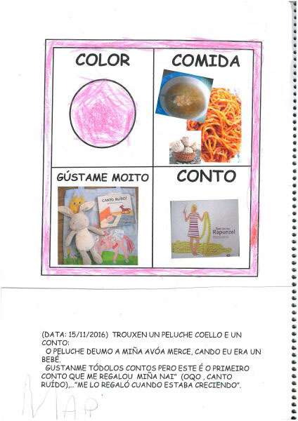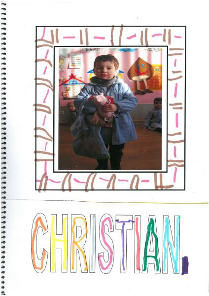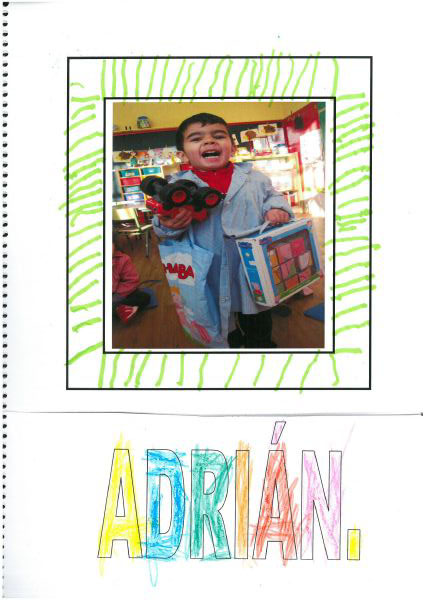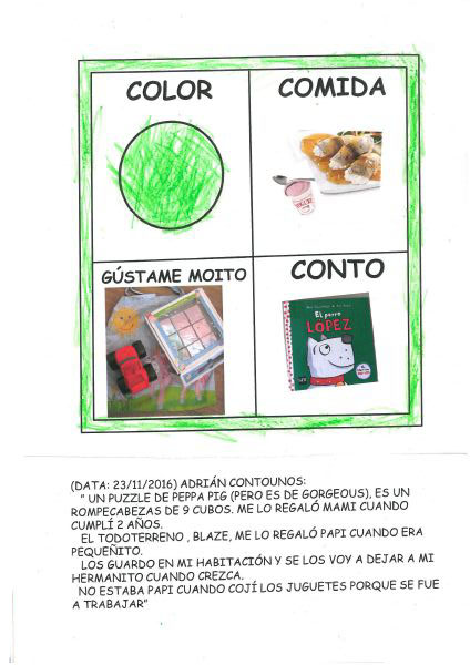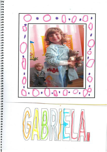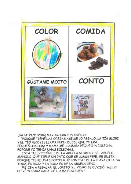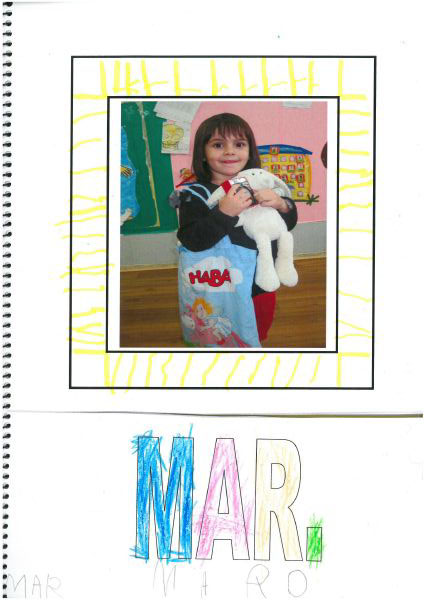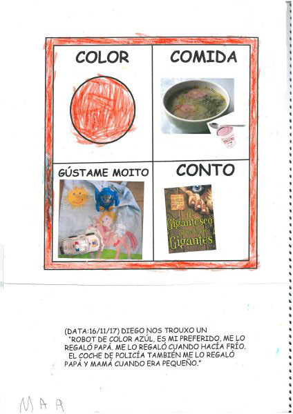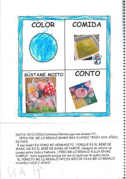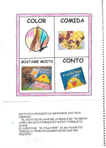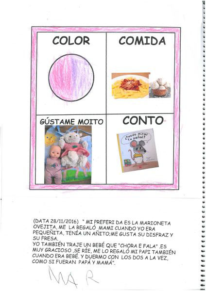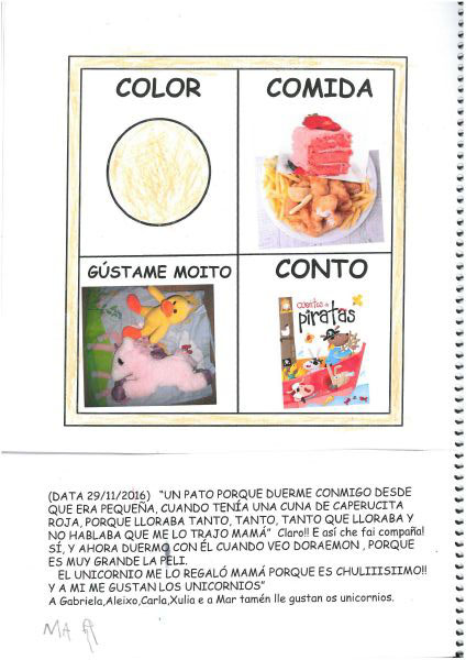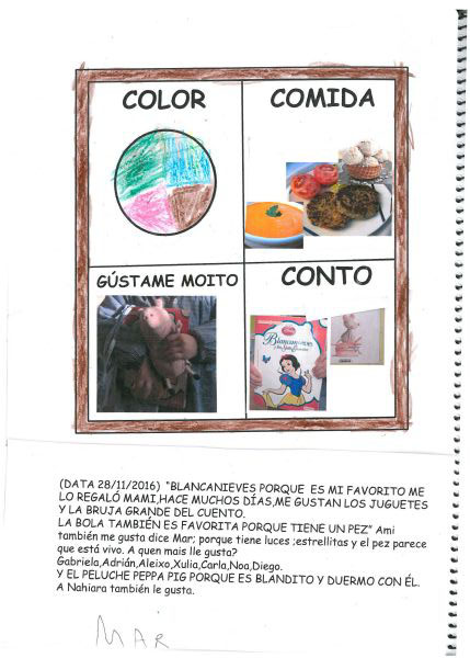 Os nenos e nenas de 3 anos A están coñecéndose. Esta vez están aprendendo os gustosa preferidos de cada un deles, así como as letras dos seus nomes. Eiquí tendes a mostra do seu libro. Mirade que ben os aprenderon: