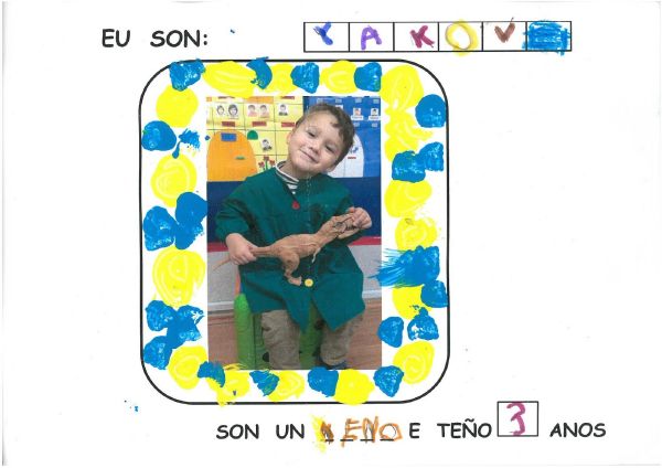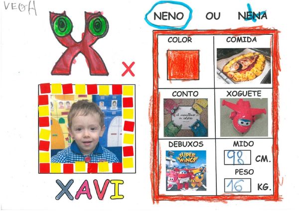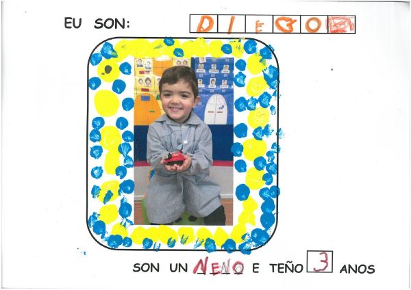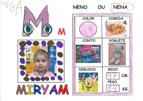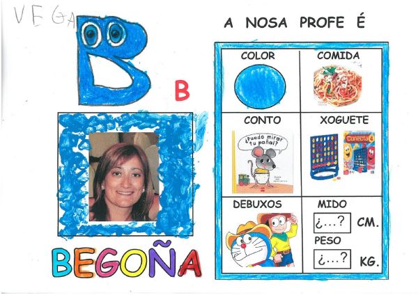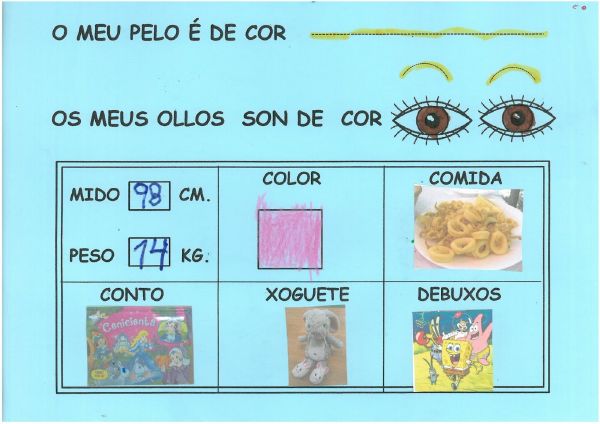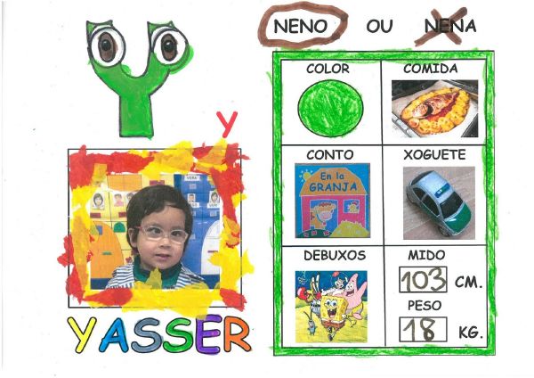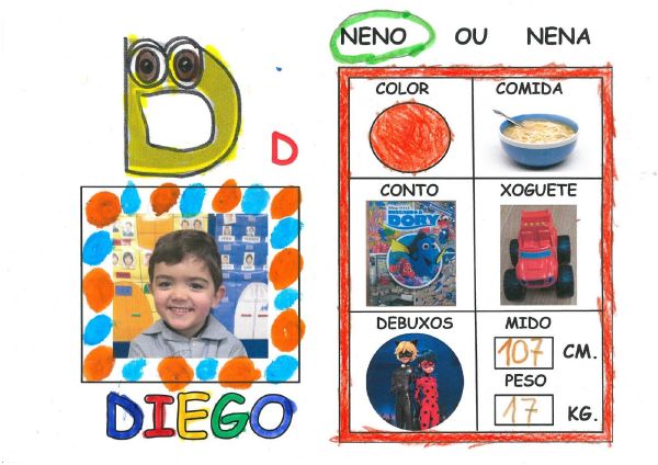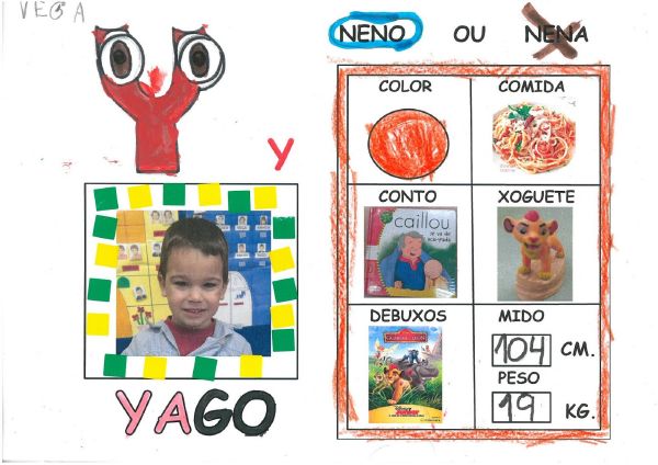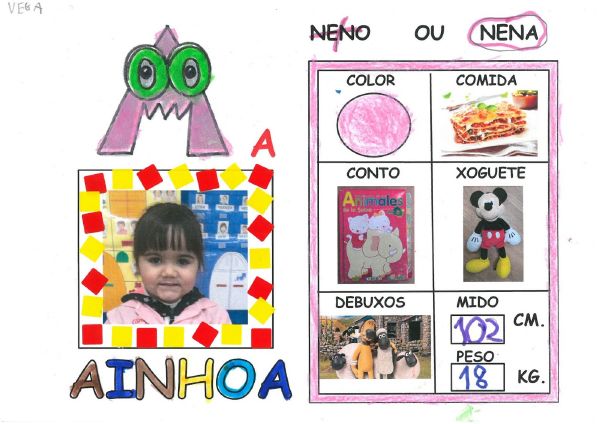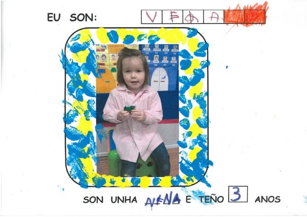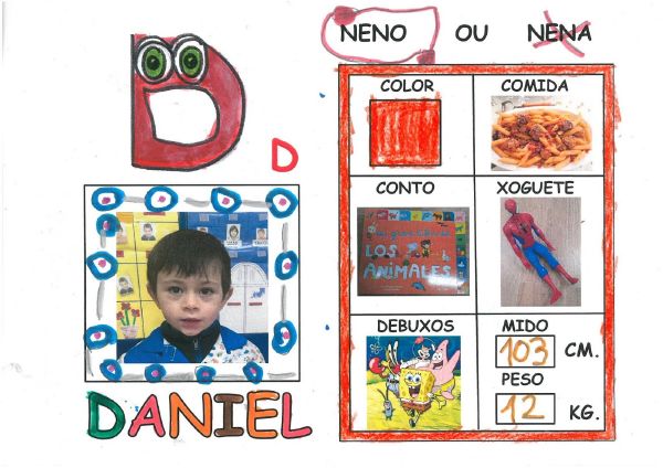 Os nenos e nenas de 3 anos B están coñecéndose. Esta vez están aprendendo os gustosa preferidos de cada un deles, así como as letras dos seus nomes. Eiquí tendes a mostra do seu libro. Mirade que ben os aprenderon: