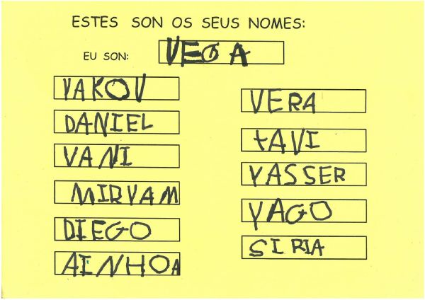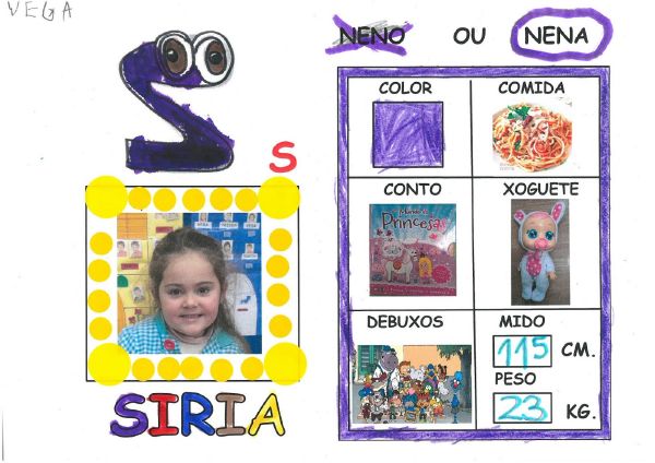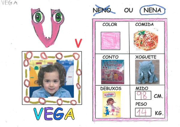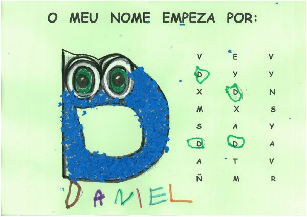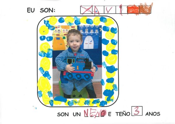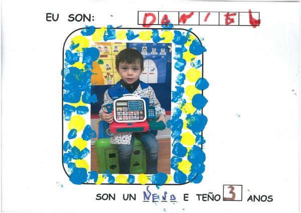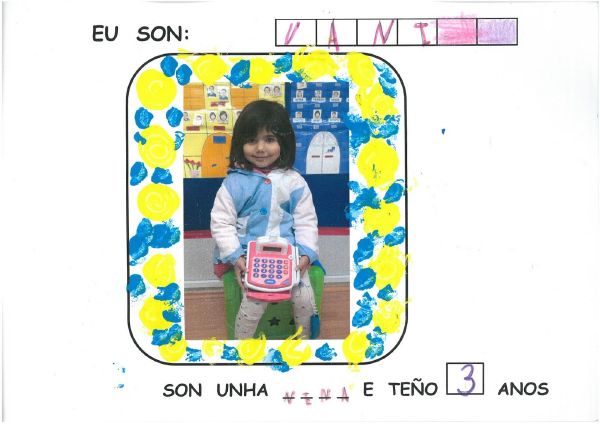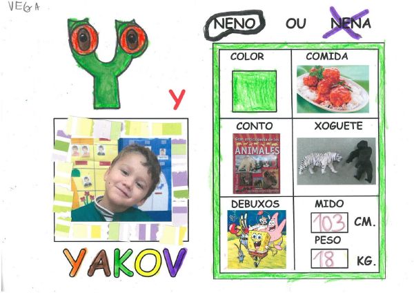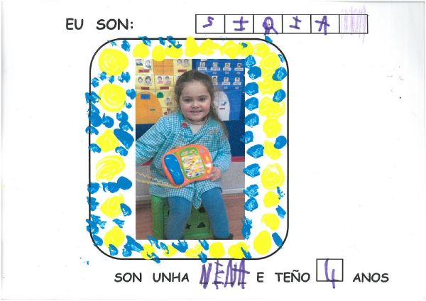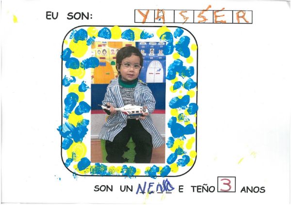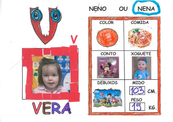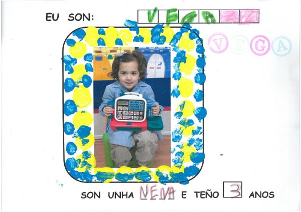 Os nenos e nenas de 3 anos B están coñecéndose. Esta vez están aprendendo os gustosa preferidos de cada un deles, así como as letras dos seus nomes. Eiquí tendes a mostra do seu libro. Mirade que ben os aprenderon: