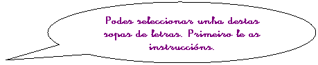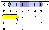 Para solucionar as Sopas de letras, pulsa primeiro no botón "COMENZAR". Sinala as palabras que vaias atopando pulsando co rato na primeira letra e, sen deixar de pulsar, move o rato ata a última letra. As letras seleccionadas aparecerán cun fondo de cor amarela. Se a palabra é correcta, verás que cambia de cor.