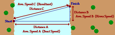 the current of the river which carries the boat downstream for the Distance B; and so any calculation involving the Distance B must involve the speed value labeled as Speed B (the river speed). Together, these two parts (or components)