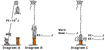22. The cartoon strip below depicts a pile-driver falling from a high elevation (diagram A) to a low elevation (diagram B) before it encounters the force of a spike which ultimately brings it to rest (diagram C). Assume that there is no air resistance and that the spike moves only slightly. Fill in the blanks in the cartoon strip.