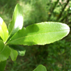 Co peciolo curto, ovalada, alongadas (2-3cm), lampiñas e coriáceas, bordos dentados. De cor verde máis escuro no haz.