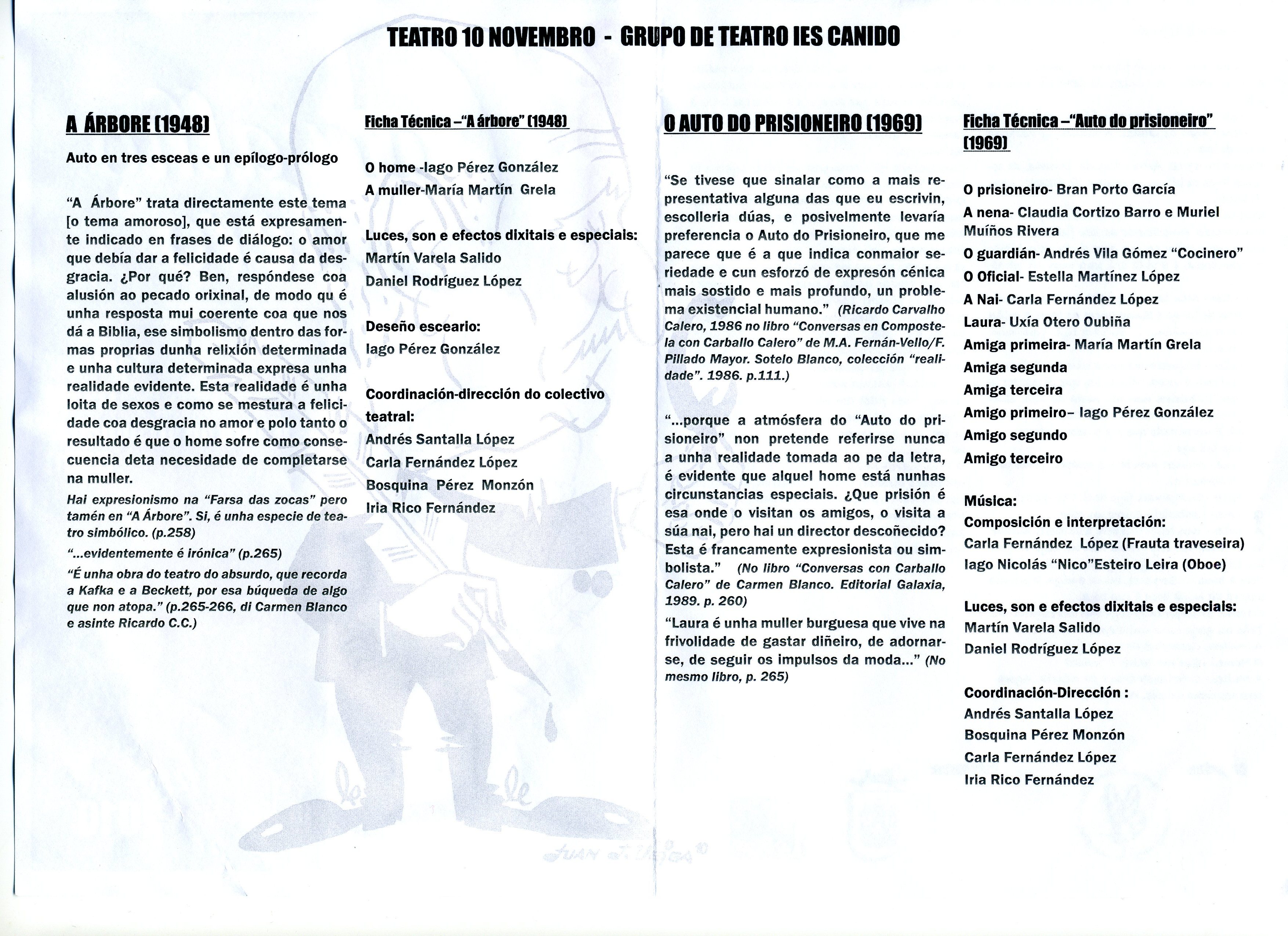 ![]() ![]() Alumnado do segundo ciclo da ESO asistiu á representación teatral das obras de Ricardo Carvalho Calero: A árbore e O auto do prisioneiro que compañeiros do IES CANIDO puxeron en escena o 10 de novembro no Centro cultural Torrente Ballester. |