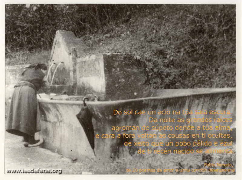 Pablo Neruda. Naceu en Parral, Chile, en 1904. O seu nome verdadeiro era Ricardo Eliécer Neftalí Reyes Basoalto. En Buenos Aires coñece a Federico García Lorca. Viaxa a Madrid, sendo cónsul en España. Participa na campaña presidencial de Salvador Allende, que gaña as eleccións e noméao embaixador en Francia. En 1971, recibe o Premio Nobel de Literatura. En 1972, regresa a Santiago debido a unha greve doenza. O 11 de setembro do 73 prodúcese o golpe de estado de Pinochet, e as súas casas son asaltadas. Falece doce días despois
