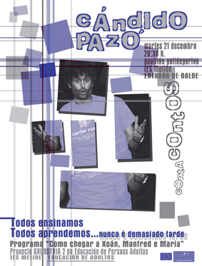 CONTACONTOS - CÁNDIDO PAZÓ (21 de decembro) Contratouse a actuación do coñecido actor, escritor e autor teatral (preme aquí para coñecelo mellor), e decidiuse abrir as portas tamén a xente externa ao instituto, de maneira que na actuación se xuntaron rapaces, adultos, e nenos. Realizouse un cartel anunciador previo á actividade.