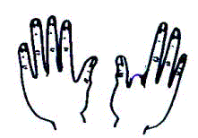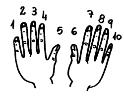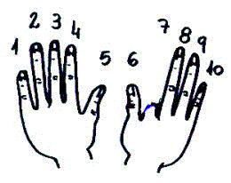 ¿Cánto é 9 x 7? Fíxate nas túas mans e estende todo os dedos . Empeza a contar dende o dedo pequeniño da man esquerda e dobra o dedo que ocupa o lugar 7 O número de dedos estendidos que quedan á esquerda do que dobrache é a primeira cifra do produto, e o número dos que quedan á dereita é a segunda cifra