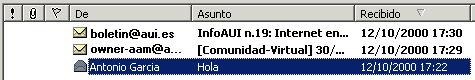Cada mensaje recibido aparece identificado en una línea de la carpeta Bandeja de Entrada con los siguientes datos: