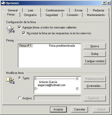 No obstante, existe una función que nos permite "personalizar" todos y cada uno de nuestros mensajes. Esta opción es la firma. La firma es un pequeño texto que se añadirá automáticamente a todos los mensajes que enviemos.