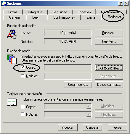 Con este tipo de firmas, no se pueden incluir imágenes, pero se puede indicar al programa de correo que utilice un estilo a la hora de crear las cartas. Para ello, se pincha sobre la pestaña "Redactar".