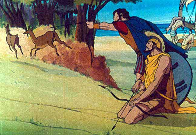 | Anterior | Inicio | Seguinte Os troianos chegan ás costas de Libia e refúxianse nunha illa coas sete naves que lles quedaban. Eneas descobre a tres cervos errantes seguidos doutros máis. Mata coas súas frechas ós tres primeiros e a sete máis dos outros, un por cada nave, e repárteos entre os compañeiros. |