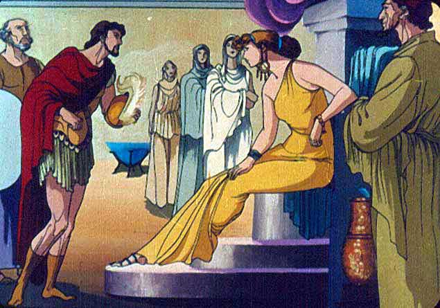 | Anterior | Inicio | Seguinte Despois de tales revelacións o consello de Venus é que se presenten no palacio de Dido. Eneas entra en Cartago envolto nunha nube, pois así o quixo a deusa. Cando a raíña anuncia que está disposta a recibir amistosamente ós troianos, a nube esvaécese e Eneas aparece ante Dido. |