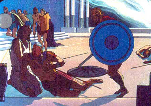 | Anterior | Inicio | Seguinte "... O vello rei Príamo, cando viu Troia en mans dos gregos, tomou as súas armas, decidido a morrer loitando. Muller e fillas intentan disuadilo. De súpeto aparece outro dos seus fillos, Polites, que vén malferido e perseguido por Pirro, que lle da alcance de novo e o volve ferir ata matalo ós pés dos seus pais. Ante as queixas de Príamo pola súa crueldade Pirro arrastra ó ancián polos cabelos, fai esvarar o seu corpo polo sangue do seu fillo e crávalle unha lanza no costado. |