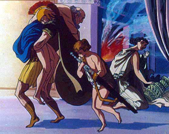 | Anterior | Inicio | Seguinte "... Eu desperto e vexo lume e confusión por todas partes. Procuro reunir ós soldados e acodo en busca do meu pai, pero el dime que non quere sobrevivir á súa patria nin abandonar a súa casa. De súpeto un aviso de Xúpiter faino decidirse a acompañarme, e cargándoo no meu lombo e co meu fillo Ascanio levando o lume sagrado da cidade e a miña esposa seguíndonos, abandonamos a cidade. |