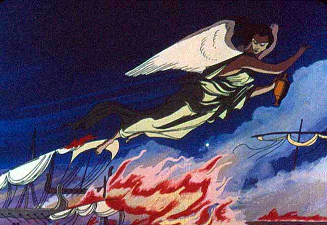| Anterior | Inicio | Seguinte Mentres a festa estaba no seu apoxeo, Xuno envía á ninfa Iris ás naves troianas. Tomando esta a figura de Béroe, preséntase ás mulleres troianas que choran a perda de Anquises, e convénceas para que prendan lume ás naves, evitando que Eneas e os seus busquen novos territorios. Eneas, ó enterarse do desastre, invoca o socorro dos deuses, que envían unha choiva que apaga o lume das naves, quedando destruídas tan só catro. |