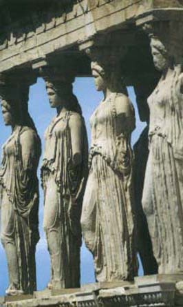 | Anterior | Inicio | Seguinte As cariátides. Presiden a construcción do Erecteion e son columnas esculpidas en forma de figura feminina. Actualmente están moi deterioradas, pero cando foron talladas lucían pulseiras e xoias de grande beleza e sostiñan os seus vestidos coas mans. |