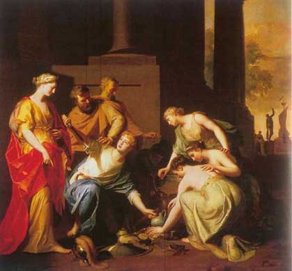| Inicio | Seguinte (Hendrick van Limborch, "Aquiles e as fillas de Licomedes"). A figura vestida de muller que agarra o puñal é Aquiles, refuxiado entre as fillas do rei Licomedes. Nesta escena Ulises disfrazado de comerciante presentalle ás rapazas xoias e armas, seguro de que só Aquiles, levado polo seu instinto guerreiro, escollerá adornos militares, revelando así as súa identidade. |