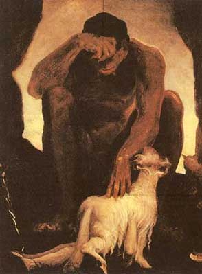 | Inicio | Seguinte (Johan Heinrich Füssli, "Polifemo cego, sentado á entrada da súa caverna, apalpa o carneiro baixo o que se agochou Ulises", 1803). Representa a Polifemo, ahora cego, palpando a unha ovella convencido de que Ulises e os seus compañeiros intentarán escapar a lombos dos animais. |
