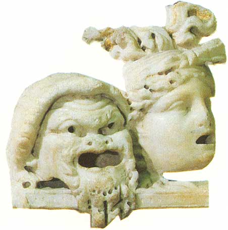 | Inicio | Siguiente Cada personaxe levaba unha máscara característica: o senex, o adulescens, o servus, a virgo, puella ou meretrix, a uxor ou matrona, os parásitos, etc. Na comedia plautina, comedia palliata, os vestidos eran gregos. A prenda básica era o quitón, camisa curta. Encima podía levarse un manto curto, clámide, ou longo, himatio, en latín pallium, que lle da nome ó subxénero cómico. |