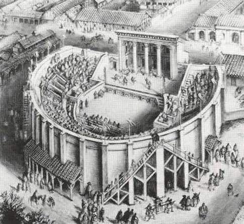 | Inicio | Siguiente O teatro de Verulamium, en Inglaterra, foi construido ó redor dos anos 140-150 d.C. Nos tempos de Plauto o teatro era só un estrado de madeira, ó aire libre, montado en calquera lugar e desmontado ó rematar a representación. Ás veces tiña unha especie de cuberta, escaleiras ata o chan e un fondo de madeira ou de pano cuhha porta ou fiestra. Máis adiante dispuxéronse gradas para os espectadores e asentos para as autoridades. |