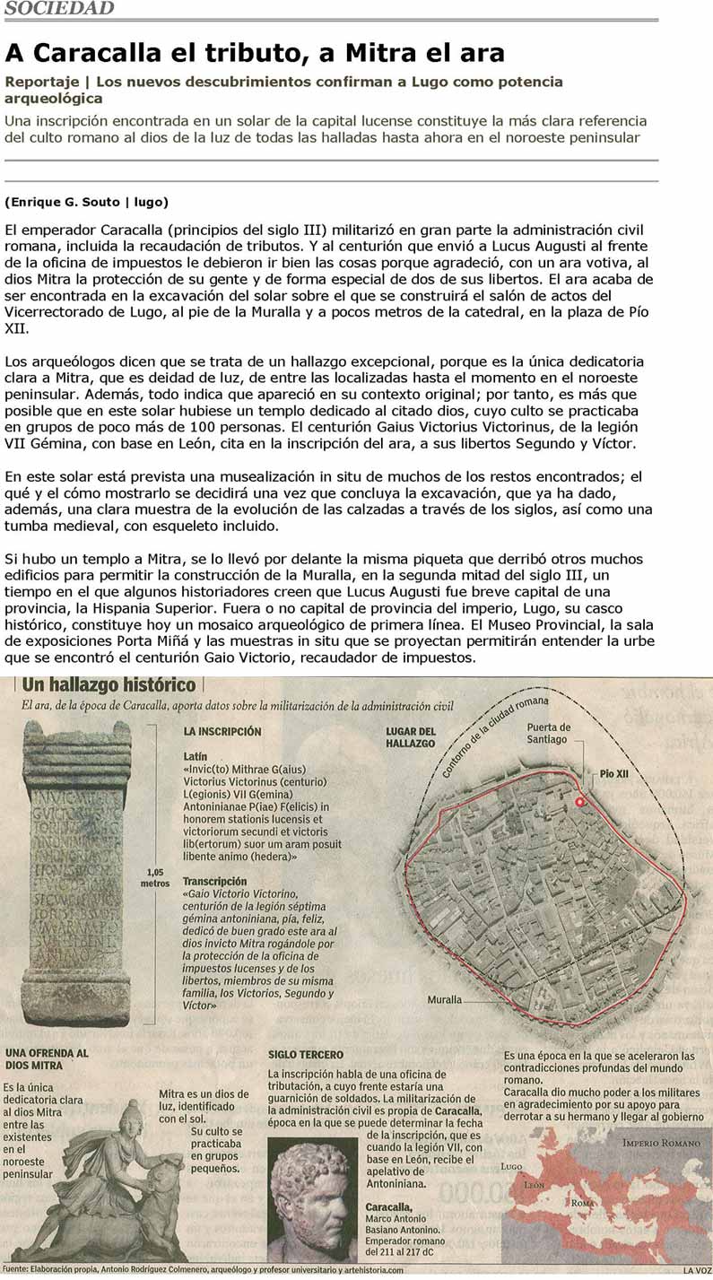 | Inicio | Seguinte É frecuente atopar na prensa novas sobre achádegos arqueolóxicos na cidade de Lugo. Na Voz de Galicia do 12/6/03 lemos o descubrimento dun ara dedicada ó deus Mitra por Gaio Victorino, centurión da legio VII Gemina. Mitra é un deus da luz, identificado co sol. Esta divindade de orixe oriental foi introducida en Roma polos lexionarios e funcionarios destinados nas provincias orientais, así como polos comerciantes e escravos. |