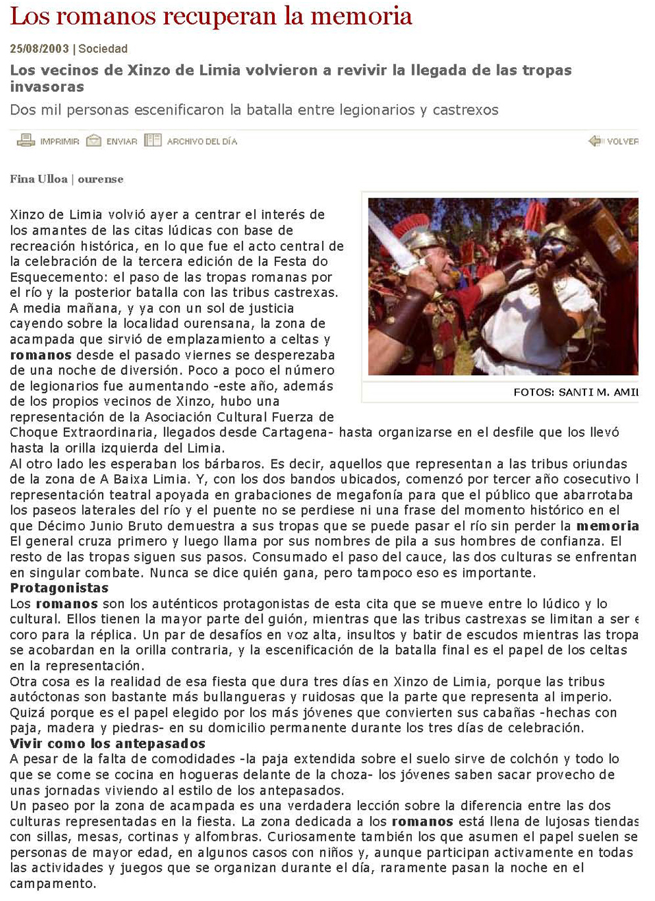 | Inicio | Seguinte Décimo Xunio Bruto, a quen despois concedéronlle o título de "Gallaicus", parece se-lo primeiro romano que cruza o Limia (137 a.C). A lenda di que os seus soldados negábanse a cruzalo, pensando que era o "río do Esquencemento"; Bruto cruza só e dende a outra beira chama ós soldados polo seu nome, demostrándolles que non se esquecía nada. Hoxe en día os veciños de Xinzo celebran unha romaría tódolos veráns para conmemora-lo acontecemento, recreando as loitas entre "galaicos" e "lexionarios". Noticia da Voz de Galicia do 25/8/03. |