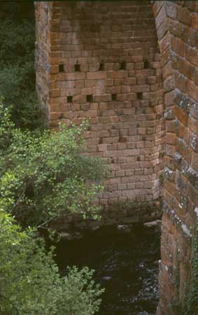 | Inicio | Seguinte Un detalle nesta ponte permítenos observar o estilo de construcción denominado a "soga e tizón", consistente en aliñar os bloques de pedra en filas alternas, unha cos bloques colocados de xeito transversal e outra cos bloques colocados de xeito lonxitudinal. |